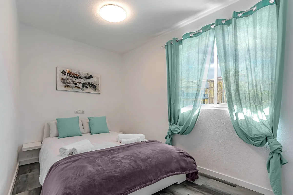 El dormitorio está decorado en tonos turquesa, blanco y gris, que evocan la belleza y serenidad de la costa del Atlántico con su arena volcánica. Cuenta con una cama doble y una tele de pantalla plana.